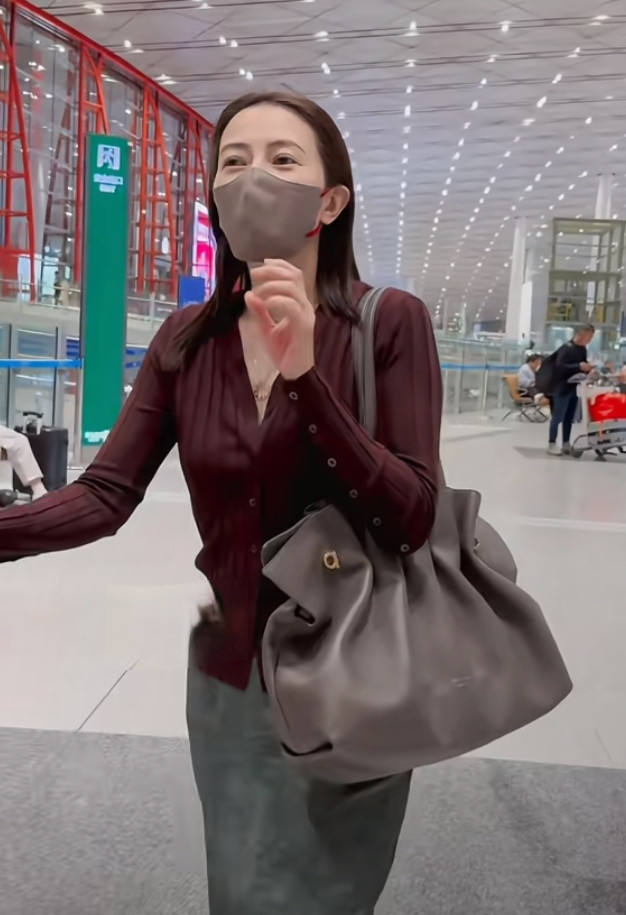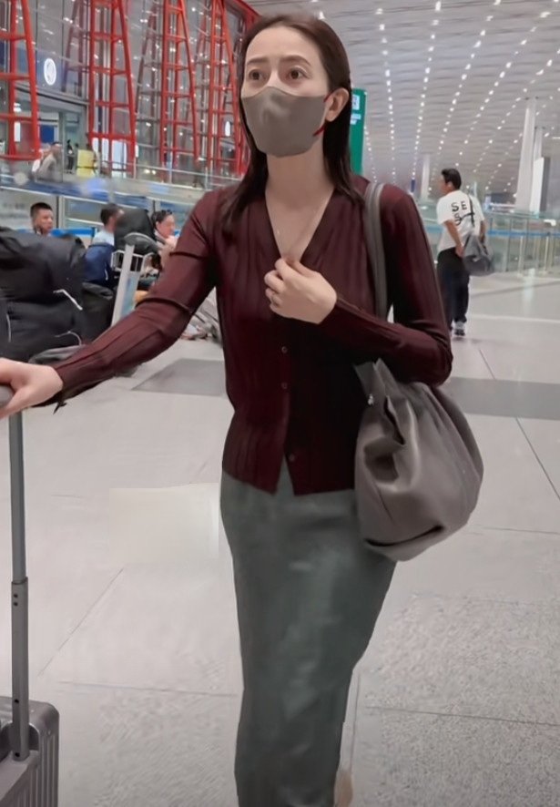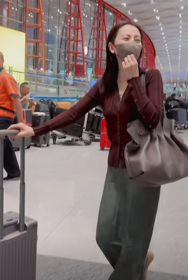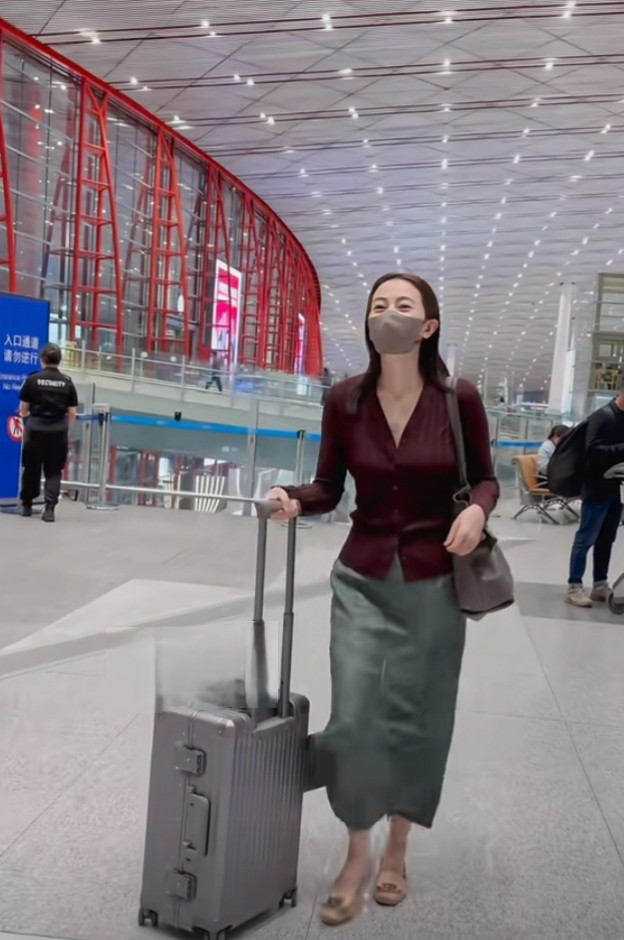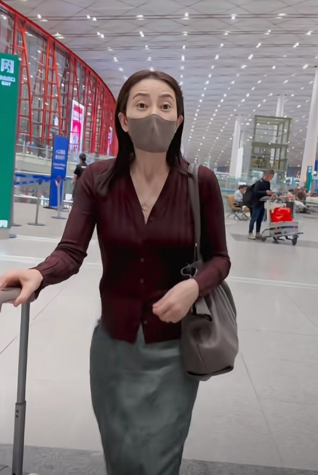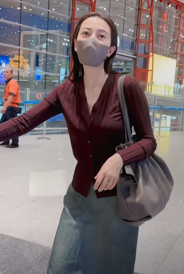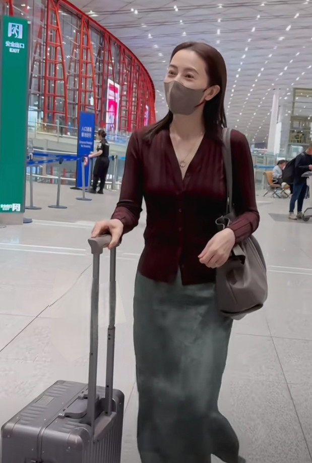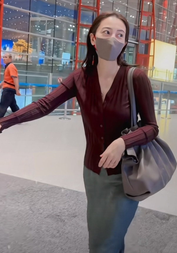 高圆圆现身机场, 酒红针织开衫配墨绿长裙, 气质温柔又高级