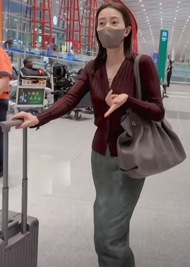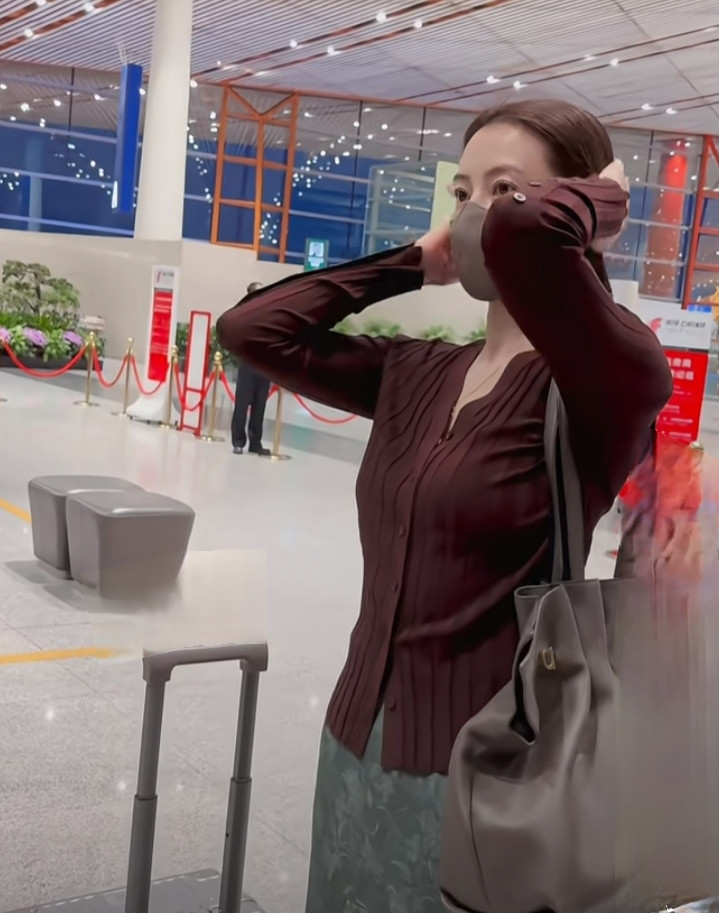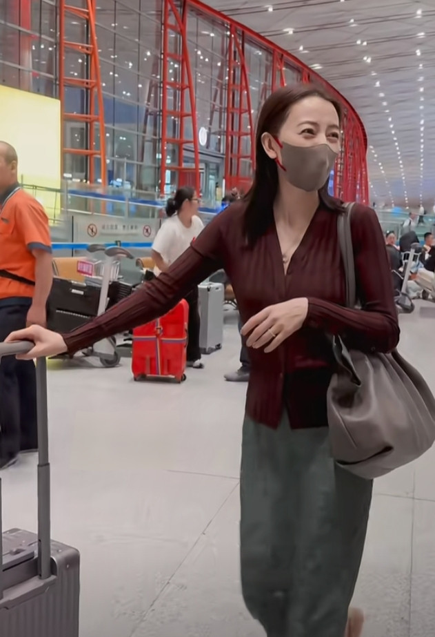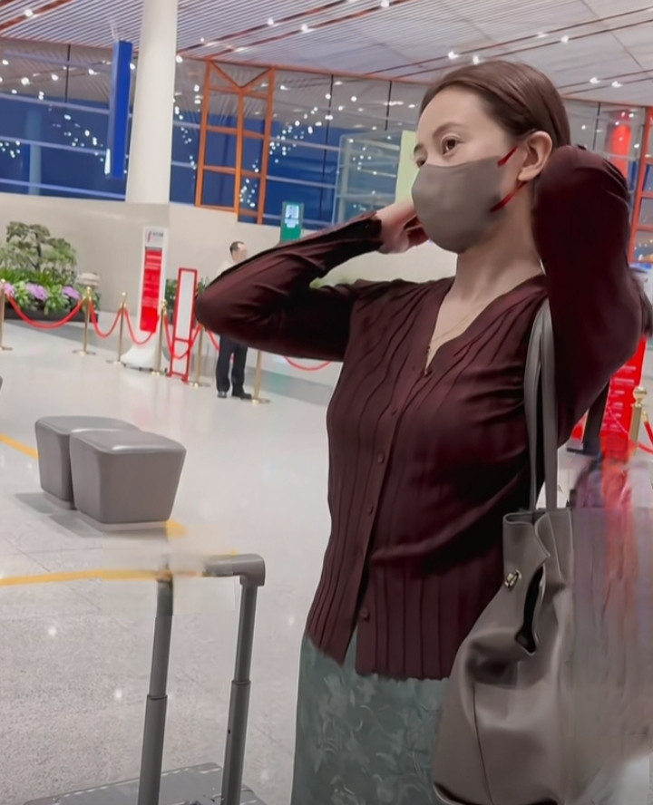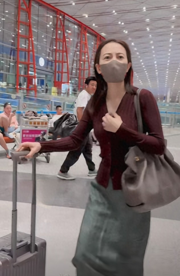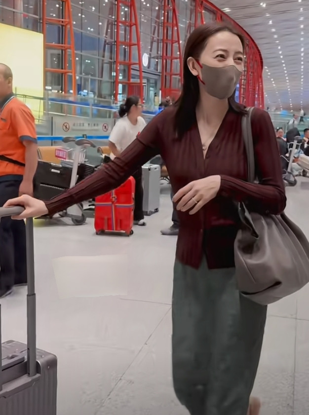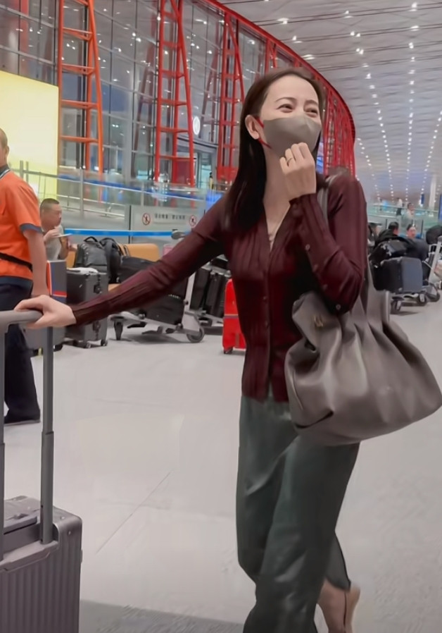 高圆圆现身机场, 酒红针织开衫配墨绿长裙, 气质温柔又高级
